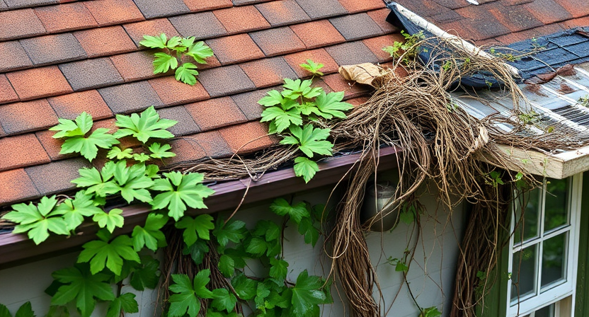 • Leaves, debris, and water become trapped within the gutter system due to creepers entangling themselves.