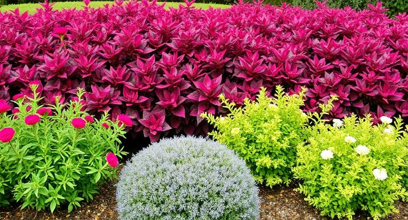 • Select plants that complement the shape, color, and texture of your shrubs